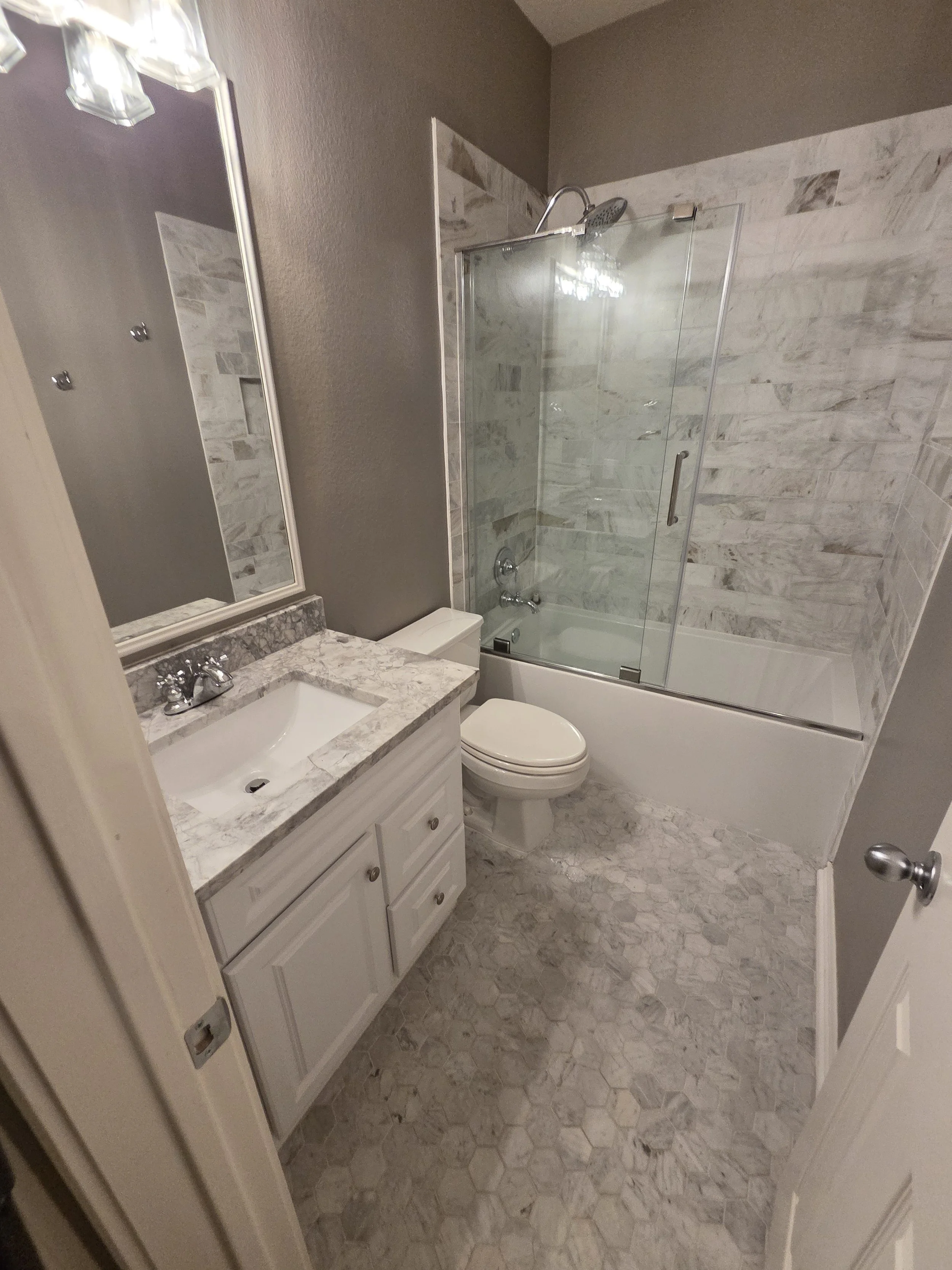 Bathrooms: sinks, toilets, tubs/showers, mirrors, floors